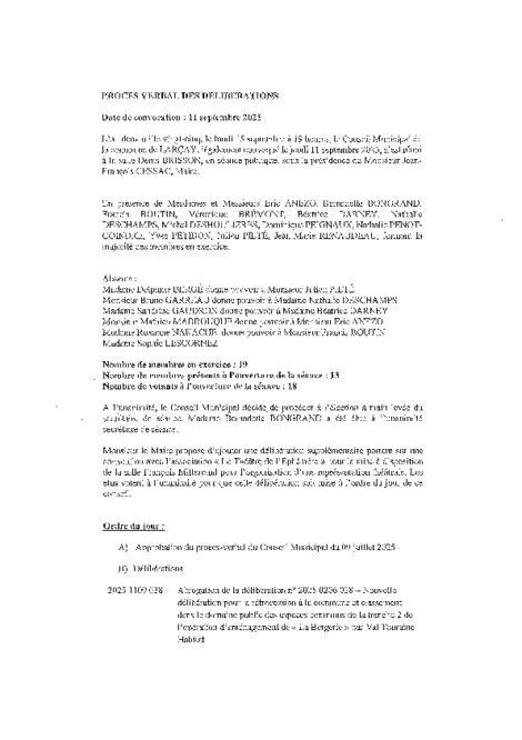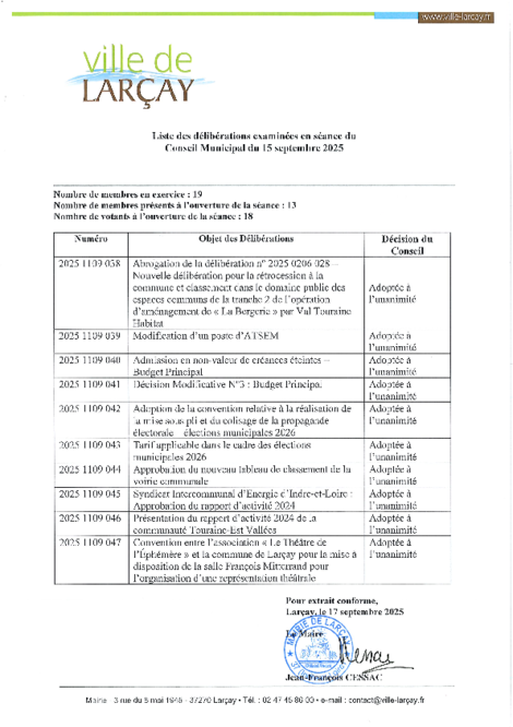 Liste des délibérations du conseil municipal du 15 septembre 2025