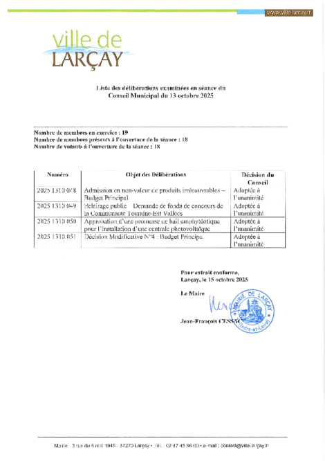 Liste des délibérations du conseil municipal du 13 octobre 2025