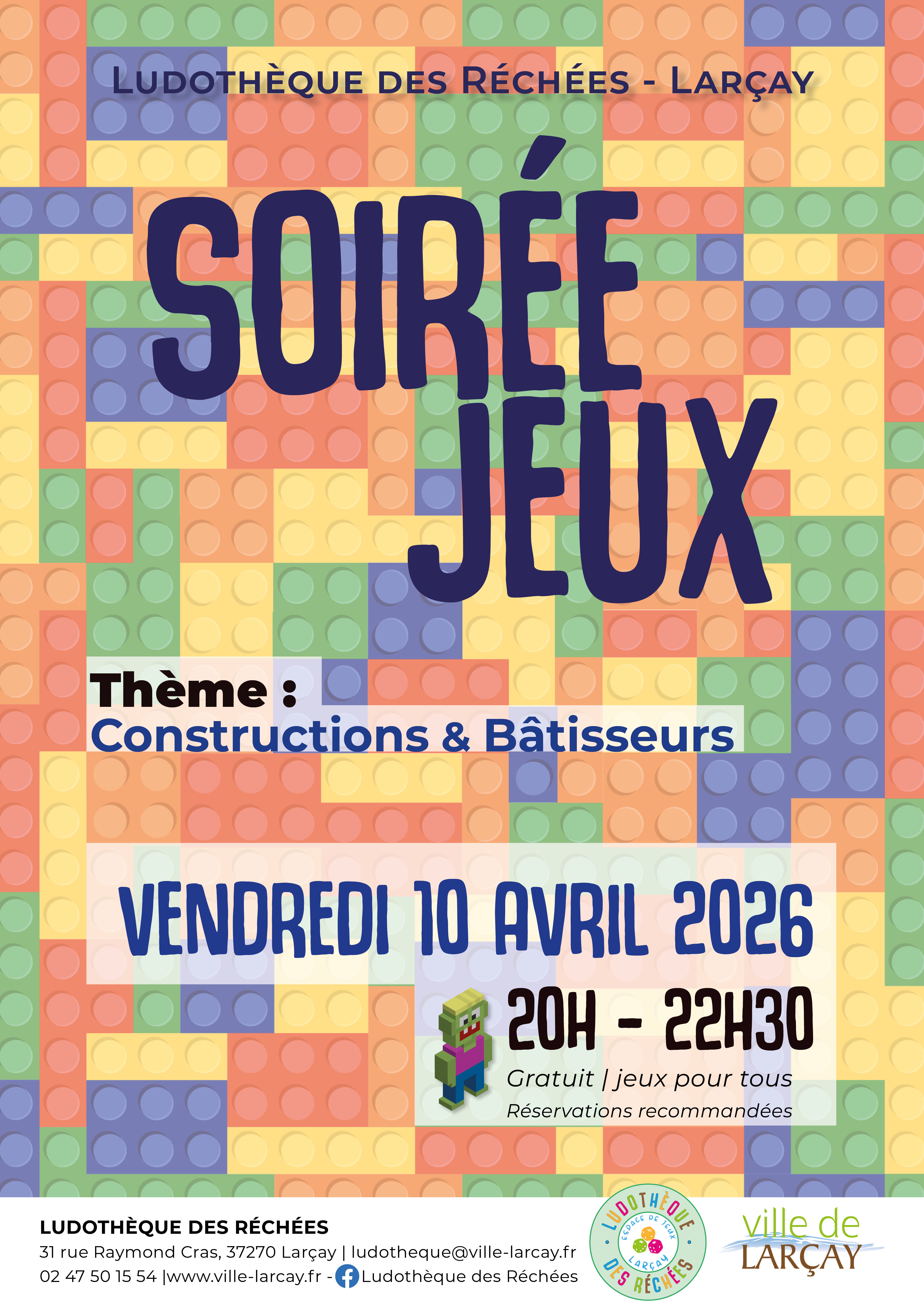 Vendredi 10 avril, la ludothèque ouvrira ses portes de 20h à 22h30 pour vous proposer une soirée jeux avant le début des vacances de printemps ! Le thème : constrcutions et bâtisseurs.